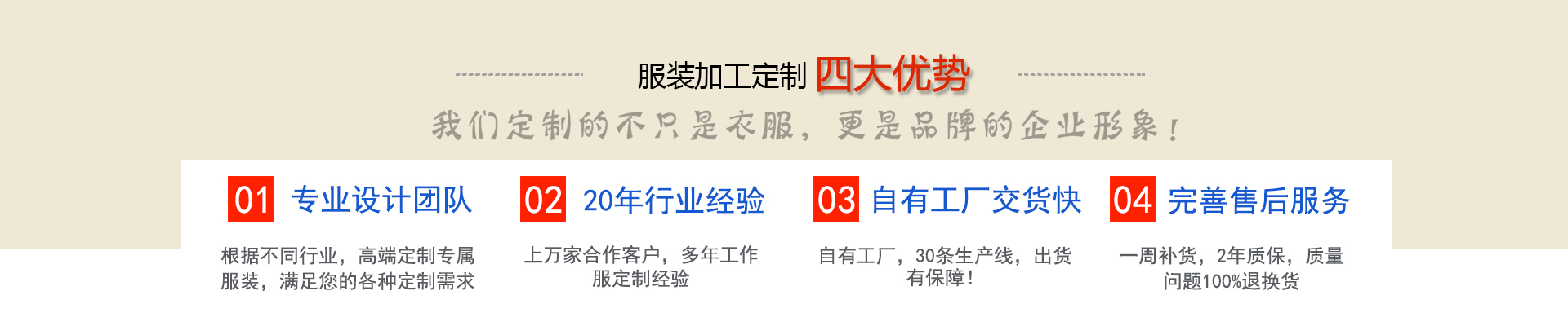 服裝加工網(wǎng)是一家及設(shè)計(jì)、生產(chǎn)、銷售為一體的專業(yè)服裝生產(chǎn)型企業(yè), 根據(jù)客戶需求定制西服襯衫工作服大衣棉服等產(chǎn)品,近二十年工作服職業(yè)裝定做經(jīng)驗(yàn)積累, 工期短交貨及時(shí),免費(fèi)提供團(tuán)體定制上門量體服務(wù),送貨上門,免費(fèi)修改,完善的售后服務(wù), 滿足您的各種定制需求!